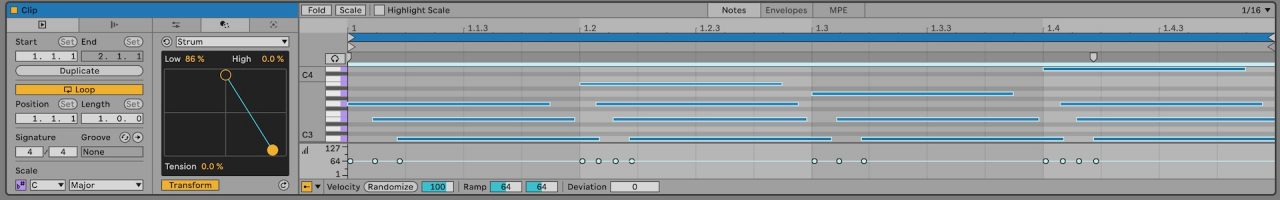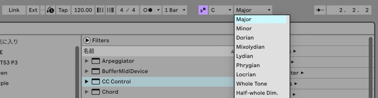Live 12では、楽曲全体のキーとスケールを指定できるソングスケールが搭載されました。ここで設定したキーとスケールをLive全体が認識するので、MIDIデータの編集だけでなくArpeggiatorなどのMIDIエフェクトも設定したキーとスケールから外れないように使うことができます。
