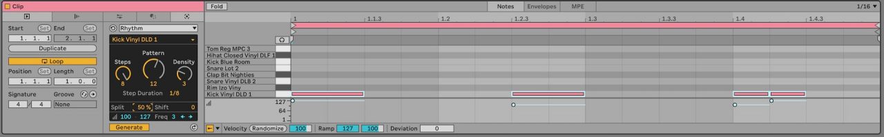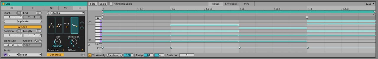 MIDI生成ツールにも数種類の機能が搭載されています。4つまでのコード進行を生成できるStackは、ソングケール機能で設定したキーとスケールを元に、適当に図形を動かすだけでコード進行が生まれます。また、リズムパターンを生成するRhythmなども搭載されているほか、Max for Liveデバイスの形でユークリッドを使用したシーケンサーも搭載されています。