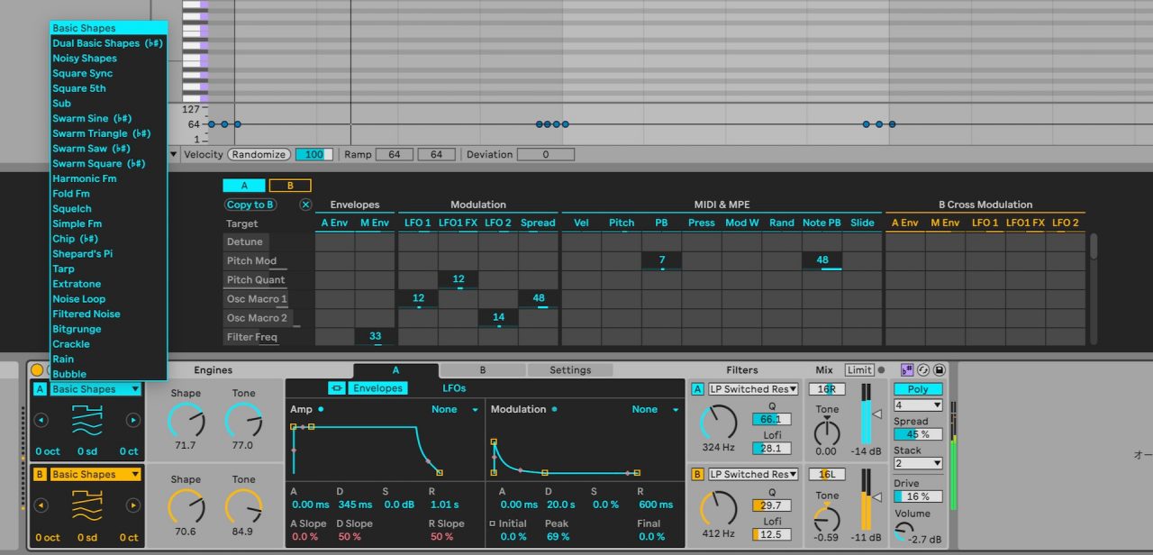 Meldの2基あるオシレーターには、それぞれマクロという音を変えるツマミが2つあり、そのツマミ等にモジュレーションかけてサウンドを変化させるシンセサイザー。