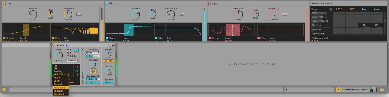 Roarは多機能なマルチバンドサチュレーター。2Mix全体にかけてサウンドの調整にも使えるし、サウンドを思いっきり加工することもできます。こちらもモジュレーションが充実していて、ショートディレイやグリッチ系エフェクトをかけたようなサウンドにも変化させられます。