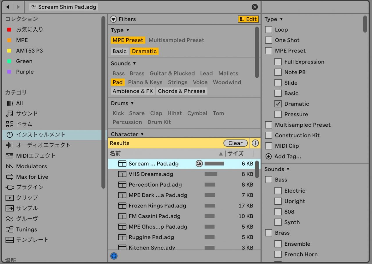 このおかげで、今のLiveの内蔵コンテンツでもプリセットを選ぶ作業が格段に楽になりました。いままではMPE対応プリセットを探すのも一苦労でしたが、これもタグ付いたので簡単になります。